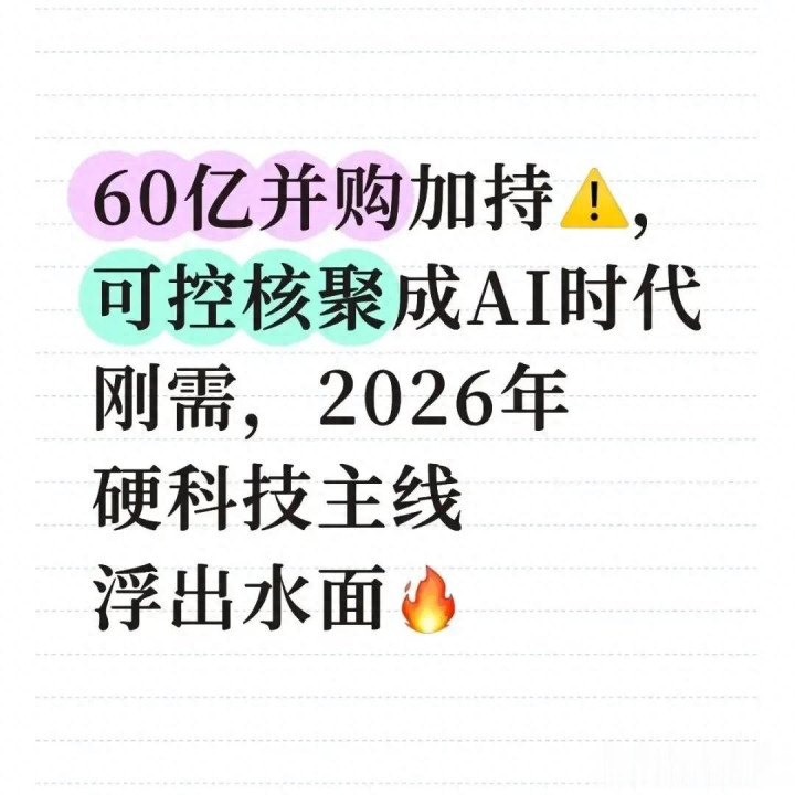 说到底,60亿并购案只是2026年硬科技主线的一个“信号”,可控核聚变成为AI时代刚需,更是产业发展的必然趋势。在硬科技的浪潮里,只有那些掌握核心技术、匹配产业需求的企业,才能真正站稳脚跟,而看懂这一点的投资者,才能抓住时代的红利。