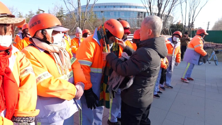 “感谢爱心人士为我们捐赠的围脖,也挺暖和的,我们的心也暖暖的,谢谢他们。”东营市东营区环卫工人生墨凤说。