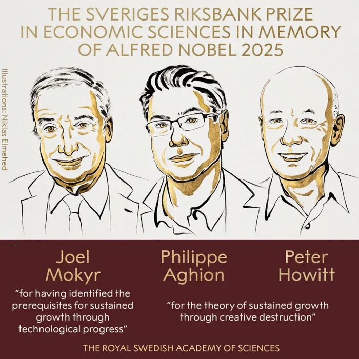 瑞典皇家科学院今天在斯德哥尔摩宣布,将2025年诺贝尔经济学奖授予经济学家乔尔·莫基尔、菲利普·阿吉翁和彼得·豪伊特,以表彰他们对创新驱动经济增长理论的阐释。