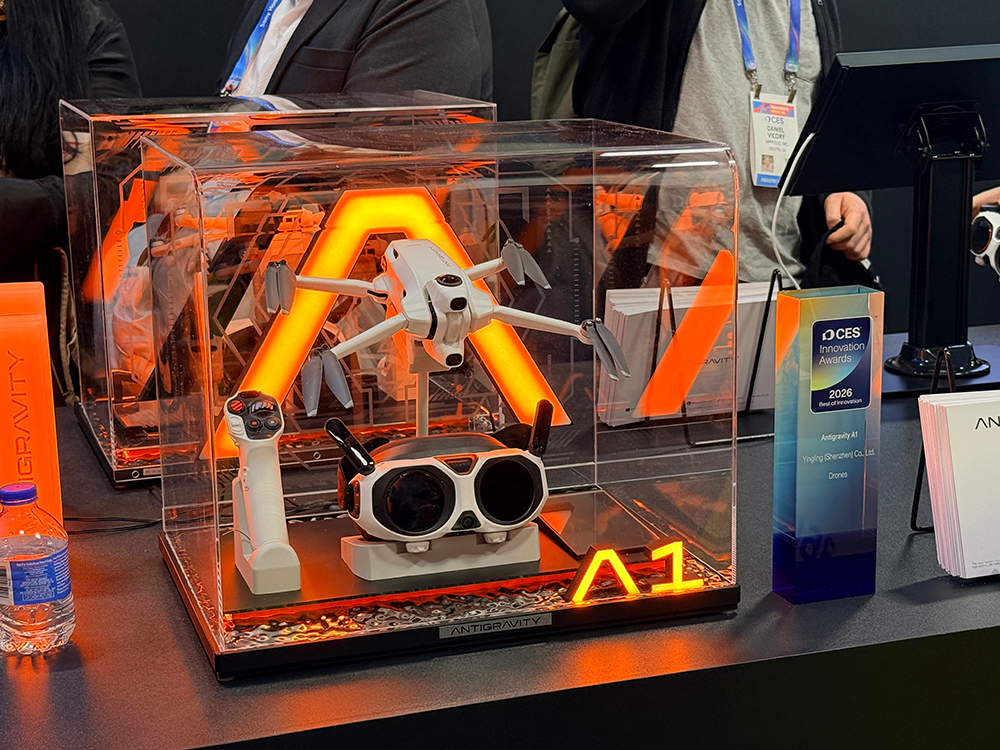 影石Insta360是一家来自深圳的智能影像公司,其主要产品是全景相机。这次他们带来了与第三方共同孵化的全景无人机产品影翎Antigravity A1,它是全球首款360°全景超高清无人机,还斩获CES无人机类最佳创意奖。其重量仅249克,拥有两颗8K全景镜头,能够捕捉无缝、无盲区的球形画面。
